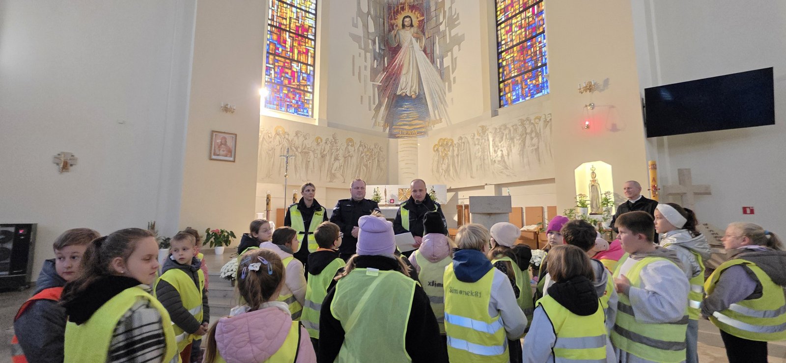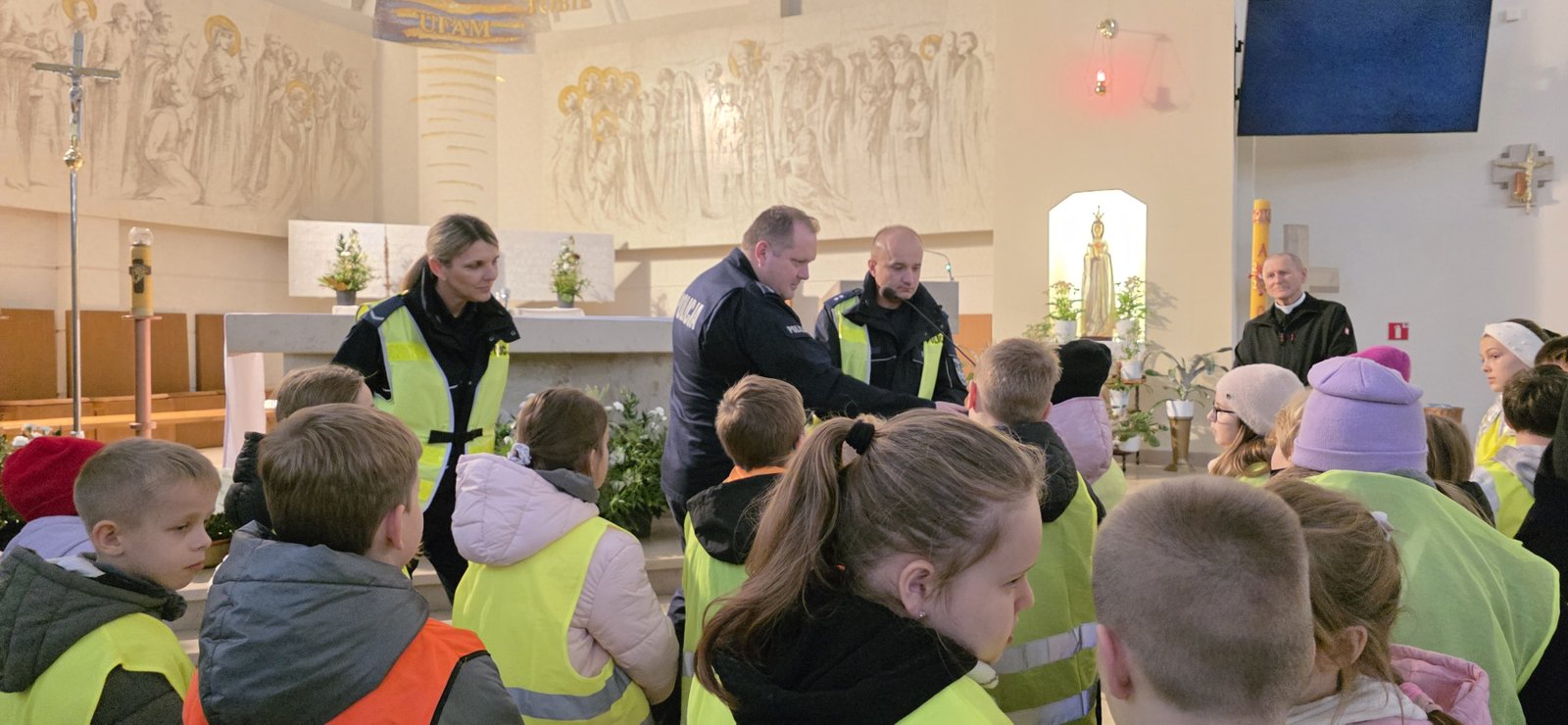 Wszystkie dzieci przyszły dziś do kościoła w kamizelkach odblaskowych, co było wyraźnym znakiem ich gotowości do dbania o własne bezpieczeństwo. Nabożeństwo różańcowe po spotkaniu z policjantem miało szczególny wymiar, bo modliliśmy się o bezpieczeństwo na drogach, a także za wszystkie osoby, które narażone są na niebezpieczeństwa podczas podróży.