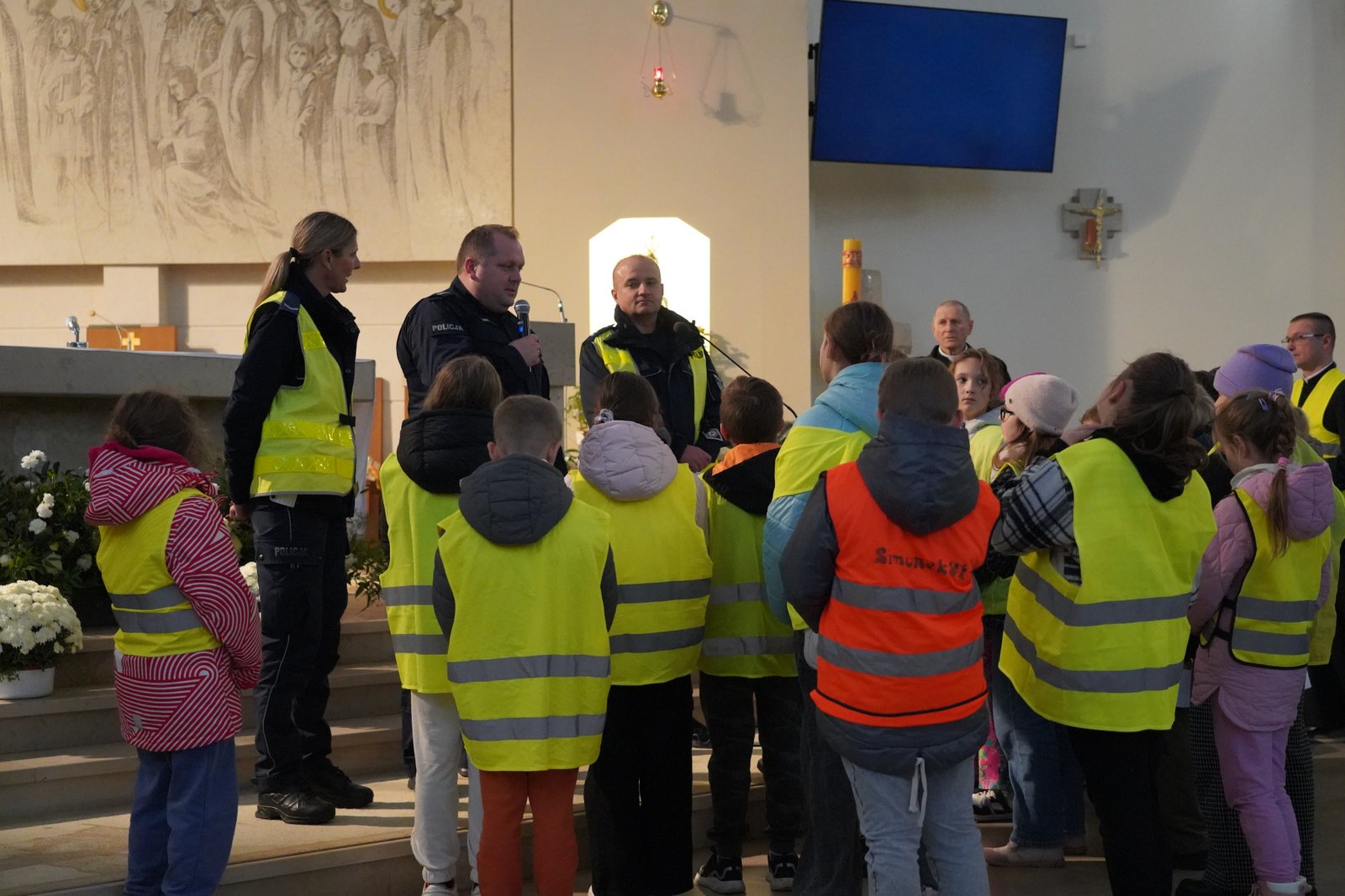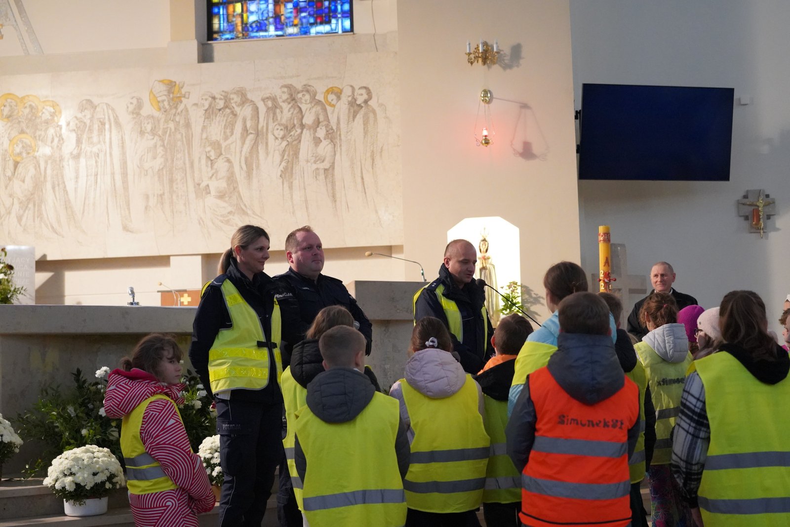 W naszym kościele – kolejny rok – odbyła się wyjątkowa akcja pod hasłem „Odblaskowy Różaniec”, która połączyła modlitwę z ważnym przesłaniem o bezpieczeństwie na drogach. Przed nabożeństwem różańcowym dzieci i ich rodzice spotkali się z przedstawicielami pińczowskiej Policji – aspirantem Dawidem Muchą, sierż. Sylwią Wieczorek oraz podkom. Pawłem Nowakiem, którzy przeprowadzili pouczającą pogadankę o bezpieczeństwie poruszania się po drogach w czasie jesieni i zimy, kiedy szybko zapada zmrok. Podkreślili, jak istotne jest noszenie odblasków, aby być widocznym dla kierowców, oraz zachowywanie odpowiednich zasad podczas poruszania się po zmroku.