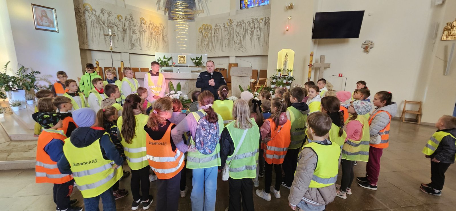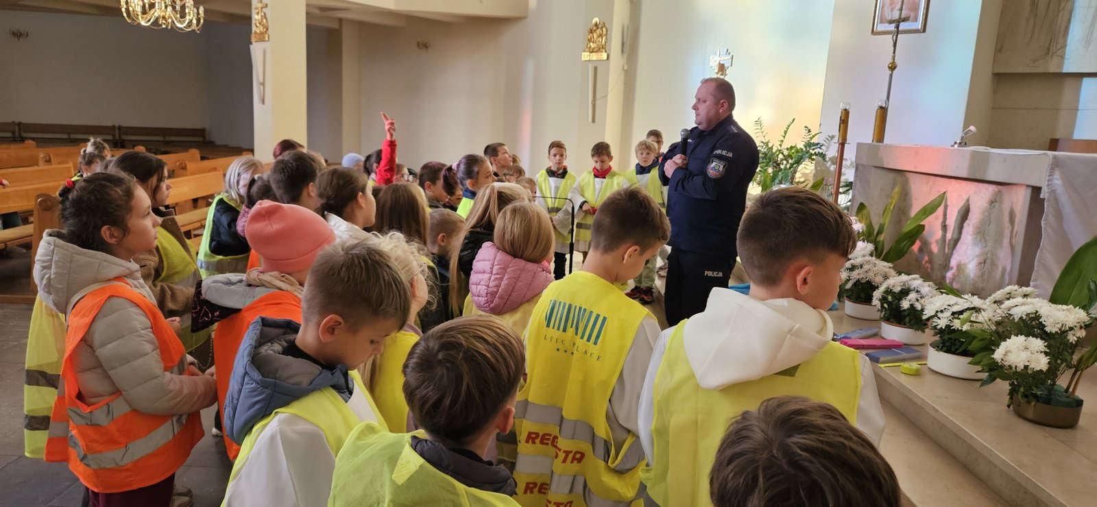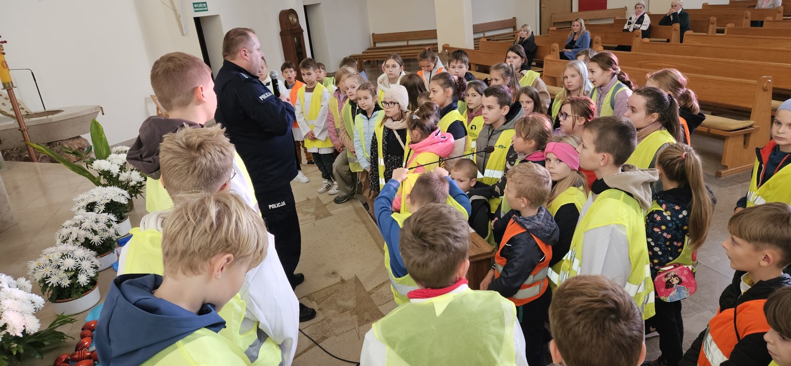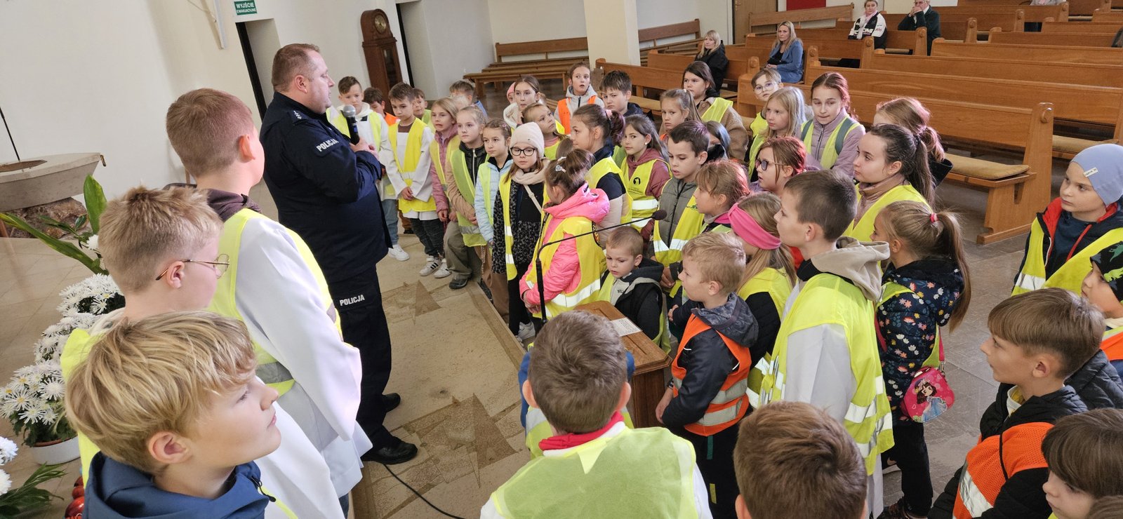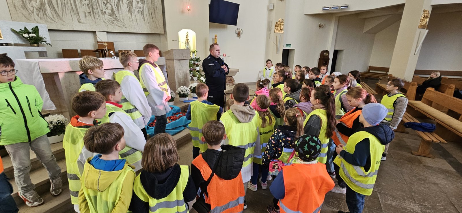 Wszystkie dzieci przyszły dziś do kościoła w kamizelkach odblaskowych, co było wyraźnym znakiem ich gotowości do dbania o własne bezpieczeństwo. Nabożeństwo różańcowe po spotkaniu z policjantem miało szczególny wymiar, bo modliliśmy się o bezpieczeństwo na drogach, a także za wszystkie osoby, które narażone są na niebezpieczeństwa podczas podróży. W wydarzeniu uczestniczyło blisko 80 dzieci, co podkreśla wagę takich spotkań.