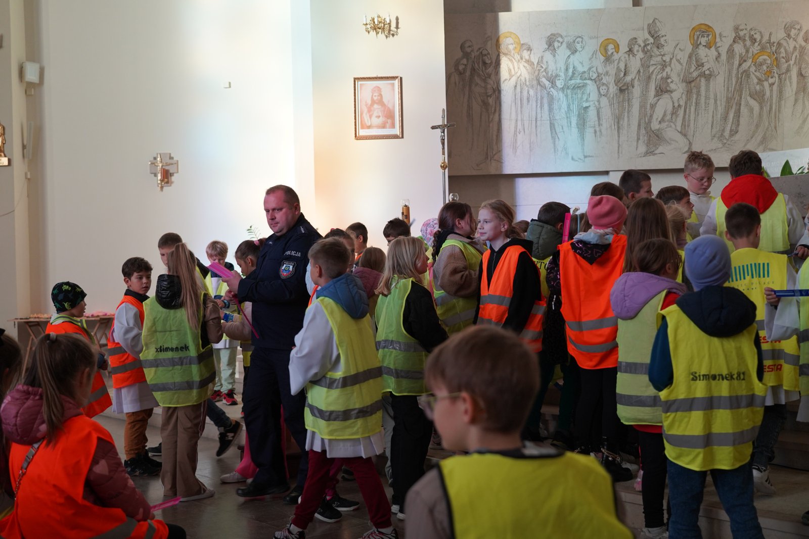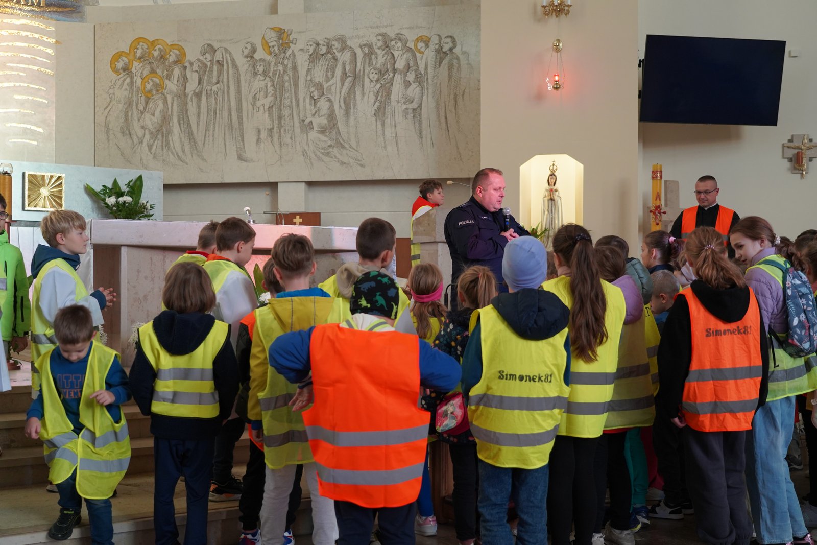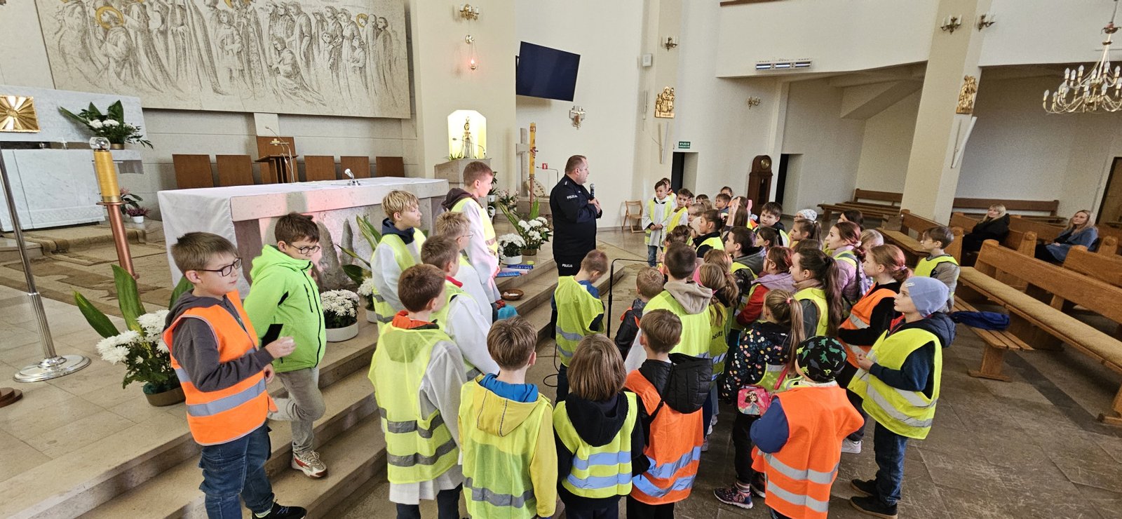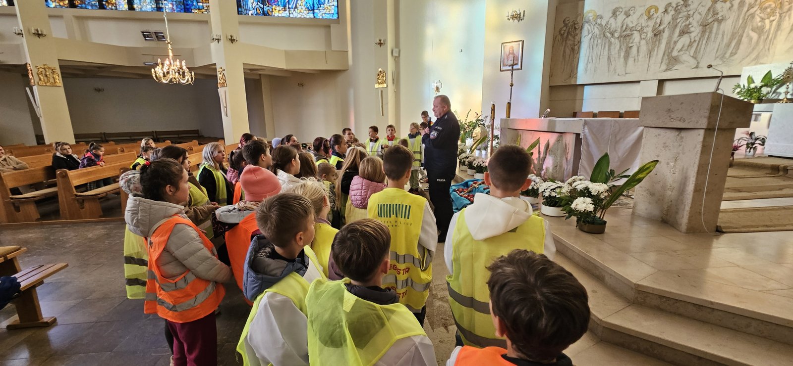 Wszystkie dzieci przyszły dziś do kościoła w kamizelkach odblaskowych, co było wyraźnym znakiem ich gotowości do dbania o własne bezpieczeństwo. Nabożeństwo różańcowe po spotkaniu z policjantem miało szczególny wymiar, bo modliliśmy się o bezpieczeństwo na drogach, a także za wszystkie osoby, które narażone są na niebezpieczeństwa podczas podróży. W wydarzeniu uczestniczyło blisko 80 dzieci, co podkreśla wagę takich spotkań.